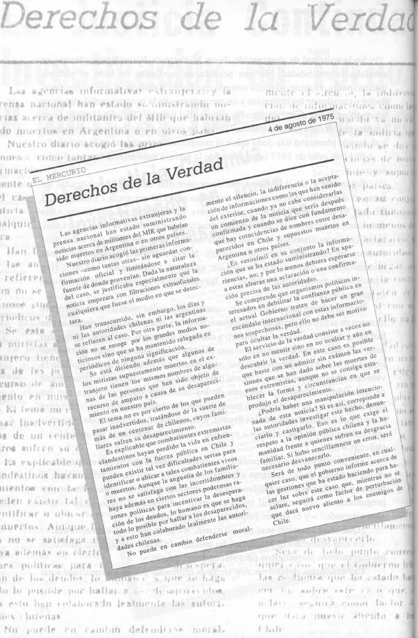 Pero al mismo tiempo agrega: � ...que algunos de los miristas supuestamente muertos en el extranjero tienen los mismos nombres de algunas de las personas que han sido objeto de recurso de amparo a causa de su desaparecimiento en nuestro país. � El Mercurio� quiere inducir una extraña coincidencia y luego de explicar lo que para él es comprensible � que combatientes extremistas hayan perdido la vida en enfrentamientos con la fuerza pública en Chile...� agrega una frase digna de reflexión...� Aunque la angustia de los familiares no se satisfaga con las incertidumbres y haya además en ciertos actores poderosas razones políticas para incentivar la desesperación de los deudos, lo humano es que se haga todo lo posible por hallar a los desaparecidos y a esto han colaborado lealmente las autoridades chilenas.�