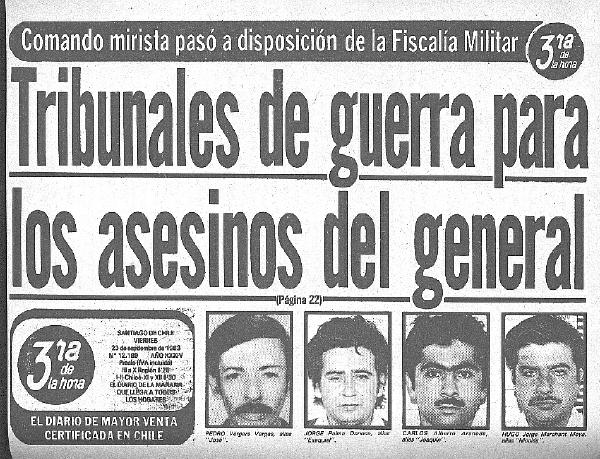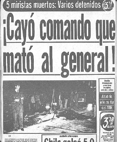 El diario La Tercera de ése mismo día -8 septiembre 83- titula en primera página: "CAYO COMANDO QUE MATO AL GENERAL"; cinco miristas muertos, varios detenidos.