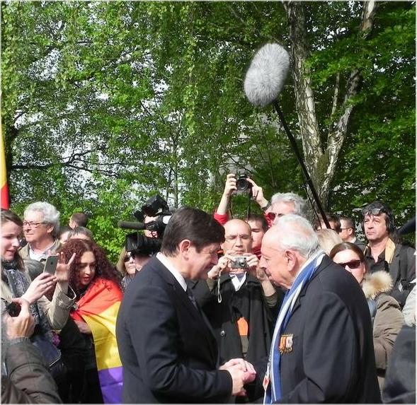 XLe ministre français de la Jeunesse et des Sports en compagnie de García-Margallo devant le monument aux républicains espagnols.