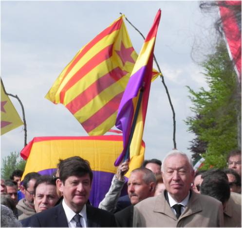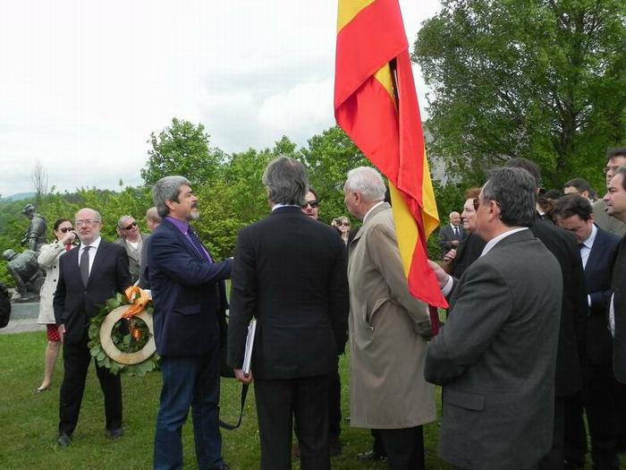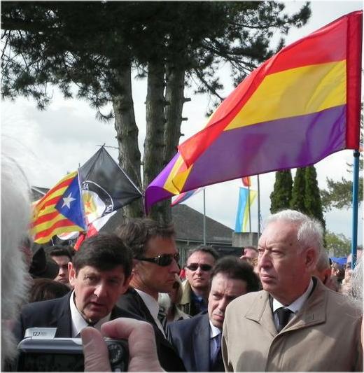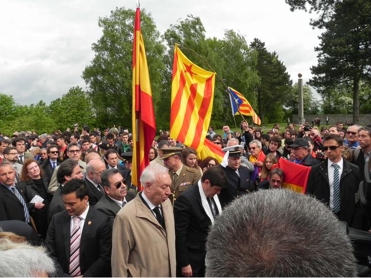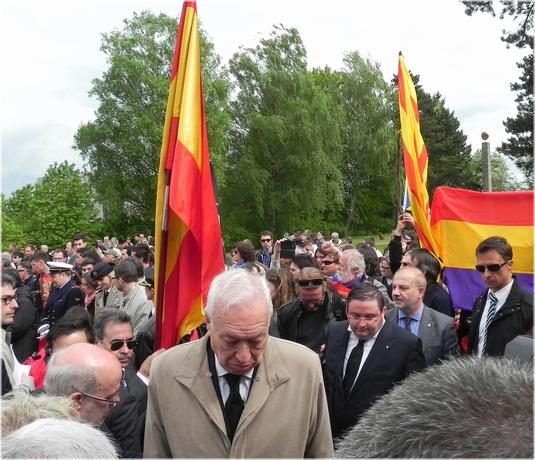Le ministre français, Patrick Kanner, et le ministre espagnol, García-Margallo, peu avant que le représentant français rende hommage aux victimes françaises devant le monument érigé par ce pays dans le camp.