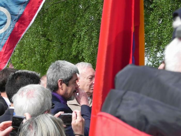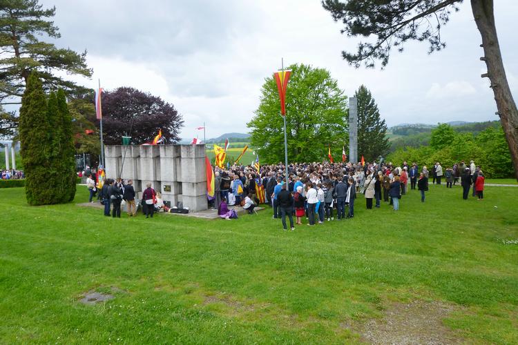 XMembres de la GRSÖ au moment du dépôt des fleurs au centre de la Place d'appel. (Photo GRSÖ, 10mai15)