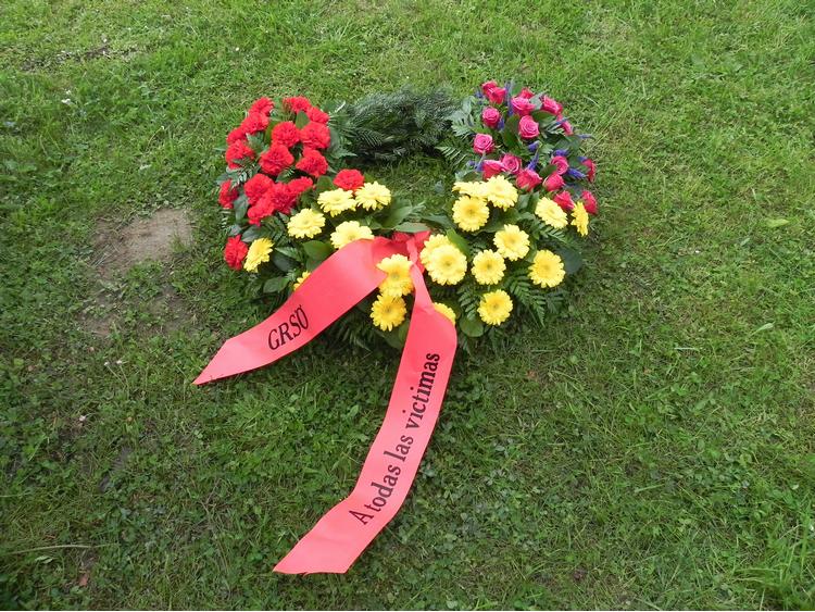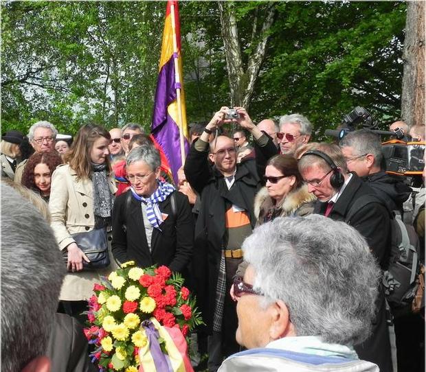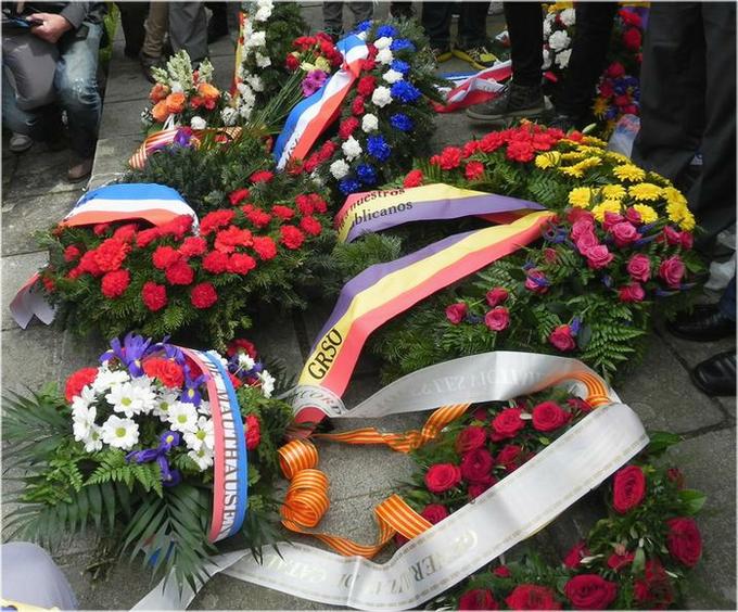 Sur le ruban tricolore de la couronne déposée par l'Association commémorative des républicains espagnols en Autriche (GRSÖ), on peut lire : "En memoria de nuestros compañeros franceses" (En mémoire de nos compagnons français).