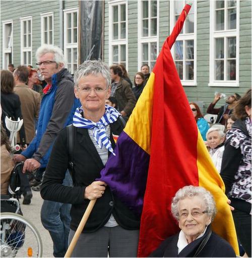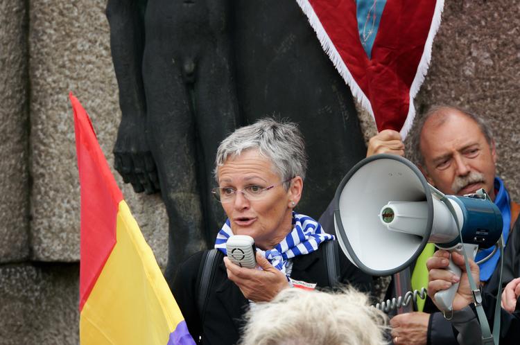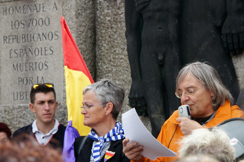 Silvia Dinhof-Cueto, présidente de la Gedenkverein der Republikanischen Spanier in Österreich (G.R.S.Ö. - Association commémorative des républicains espagnols en Autriche) lors de l'intervention de GRSÖ devant le monument aux républicains espagnols. Silvia est la fille de Víctor Cueto Espina, républicain espagnol né à Ceceda, dans les Asturies. Víctor Cueto fut fait prisonnier le 4 juin 1940 à Malo-les-Bains (France), et ensuite interné dans le Stalag XIII A. Le 11 juillet 1940, il fut transféré au Stalag VII A et ensuite déporté vers Mauthausen, où il arriva le 5 août 1940 et où lui fut attribué le numéro de matricule 3438. Il fut libéré par les troupes alliées dans le camp annexe d'Ebensee le 6 mai 1945.