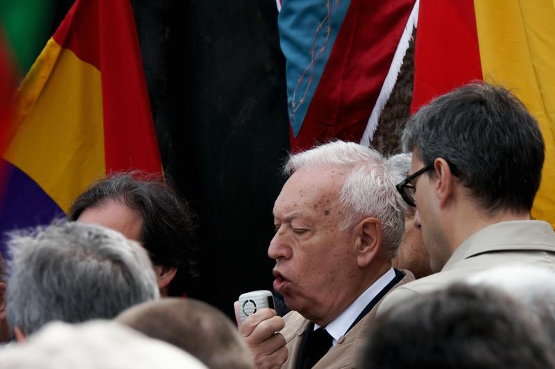 José Manuel García-Margallo, avec un porte-drapeau, entouré de nombreux gardes de sécurité qui ne portaient aucun signe d'identification.