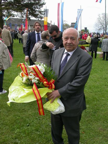 XLe président de l'Amicale de Mauthausen, Enric Garrica, discute avec le ministre espagnol García-Margallo et les représentants de l'ambassade quelques minutes avant la cérémonie auprès du monument aux Espagnols.