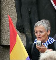 Silvia Dinhof-Cueto Silvia Dinhof-Cueto prometió a su padre que mientras ella viva ondeará la bandera republicana en el campo de exterminio nazi de Mauthausen (Austria), donde murieron cinco mil españoles. Su padre, Víctor Cueto, nacido en Ceceda (Asturias) en 1918, sobrevivió a aquel infierno porque un nazi lo sacó de la cantera y lo mandó a trabajar en una huerta; comía algún tubérculo a escondidas; pesaba 39 kilos el día de la liberación, hace ahora 70 años. Se quedó a vivir en Austria y falleció en Lenzing en 1990. Ella ha cumplido su palabra, aunque no le ha resultado fácil porque después de tantos años de desprecio y olvido del Estado español, es como si el símbolo que recuerda que aquellos españoles que lucharon y murieron por la libertad eran republicanos, molestase a alguien. En conversación telefónica con cuartopoder, a Silvia, que preside la Asociación Conmemorativa de los Republicanos Españoles en Austria, le parece "muy bien" que acudan dos ministros del Gobierno a rendir homenaje a los "héroes" de Mauthausen, y pide que "no les falten al respeto" arriando la bandera republicana.