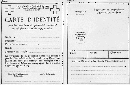 Les pièces d'identité militaires dont ce personnel sera porteur spécifieront l'instruction sanitaire reçue par le titulaire, le caractère temporaire de ses fonctions et le droit qu'il a au port du brassard.