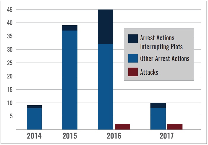 The dataset consists of four attacks and 103 arrest actions |3| in Belgium linked to or inspired by the Islamic State during the observed time period. A total of 135 individuals were arrested as a result of the 103 arrest actions. Only individuals who were indicted for a terrorist offense were included. As demonstrated in Figure 1 below, the number of arrest actions rose considerably from 2014 to 2015, and reached its peak in 2016–the same year that attacks also first appear in our dataset. This increase was followed by a significant drop in incidents from 2016 to 2017. |4| Another noteworthy trend is that 17% of all arrest actions resulted in the disruption of a plot, where evidence was found that the individuals] arrested had developed operational plans or targets, or both. |5| The overwhelming majority of these plots, 72%, were disrupted in 2016 by authorities.