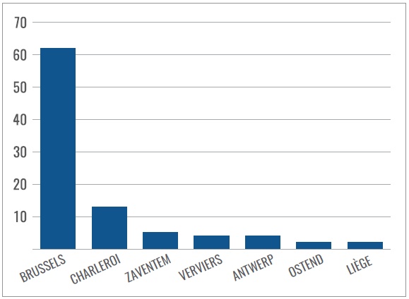8. The high number of incidents in Charleroi is not tied to Charleroi being home to Belgium's second-largest international airport, as only one individual in the dataset was arrested at that airport without having any other link to Charleroi. [Back]